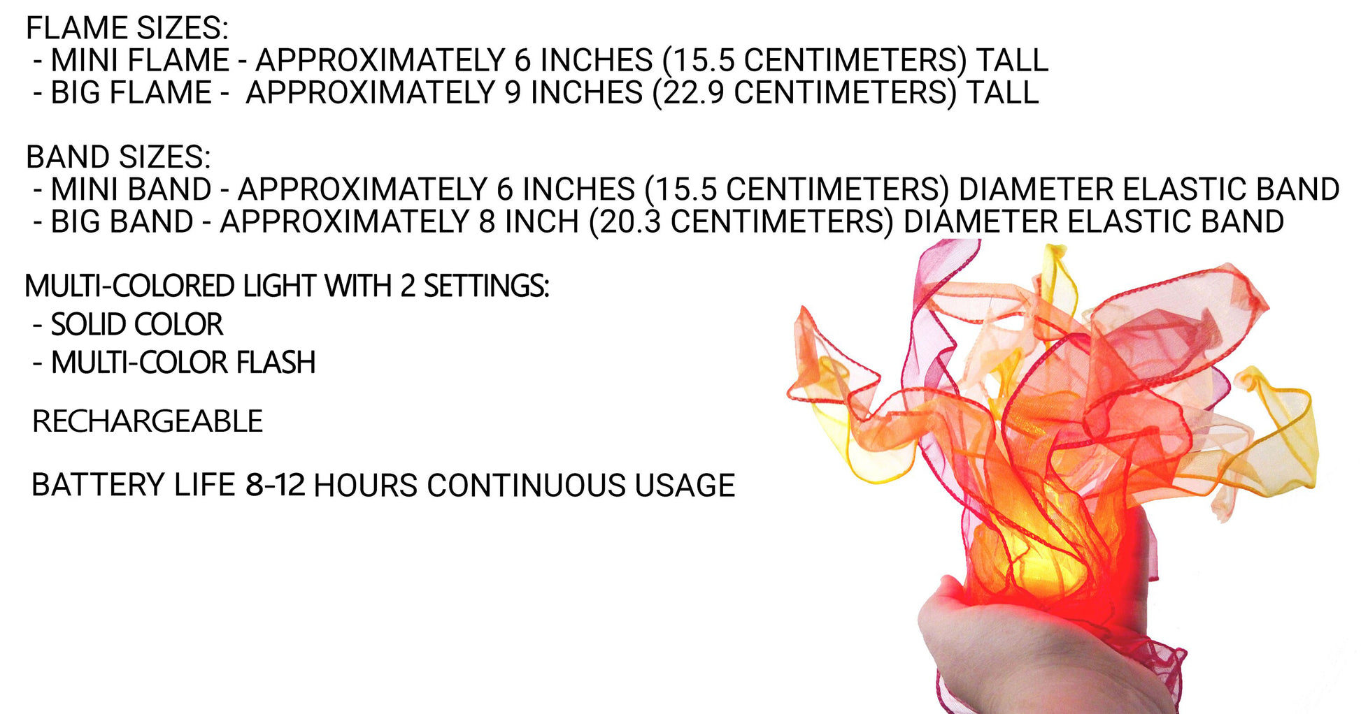 The light is a multi-color light with 2 settings - solid color and multi-color flashing. It is rechargeable. The lifespan of the battery is 8-12 hours of continuous usage and is easy to charge! The prop sizes are: