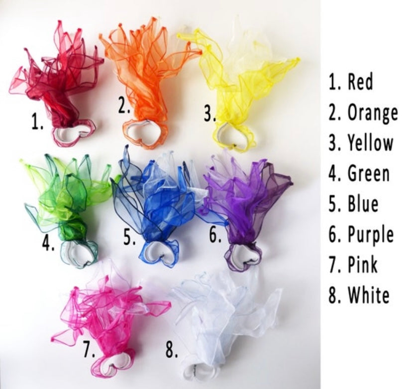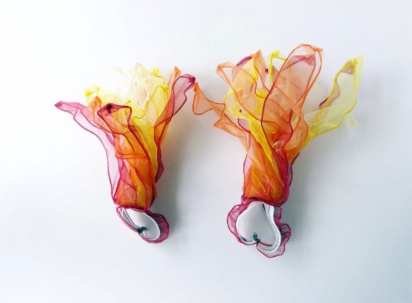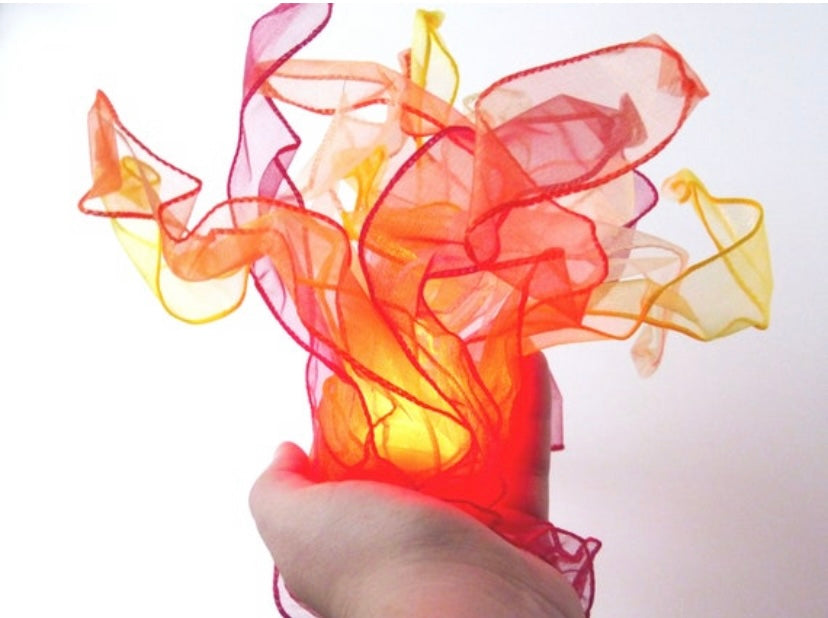 Cosplay fire prop made from LED lights and semi-transparent wired fabric on an elastic loop for hands-free posing. The perfect addition for your magical costume!